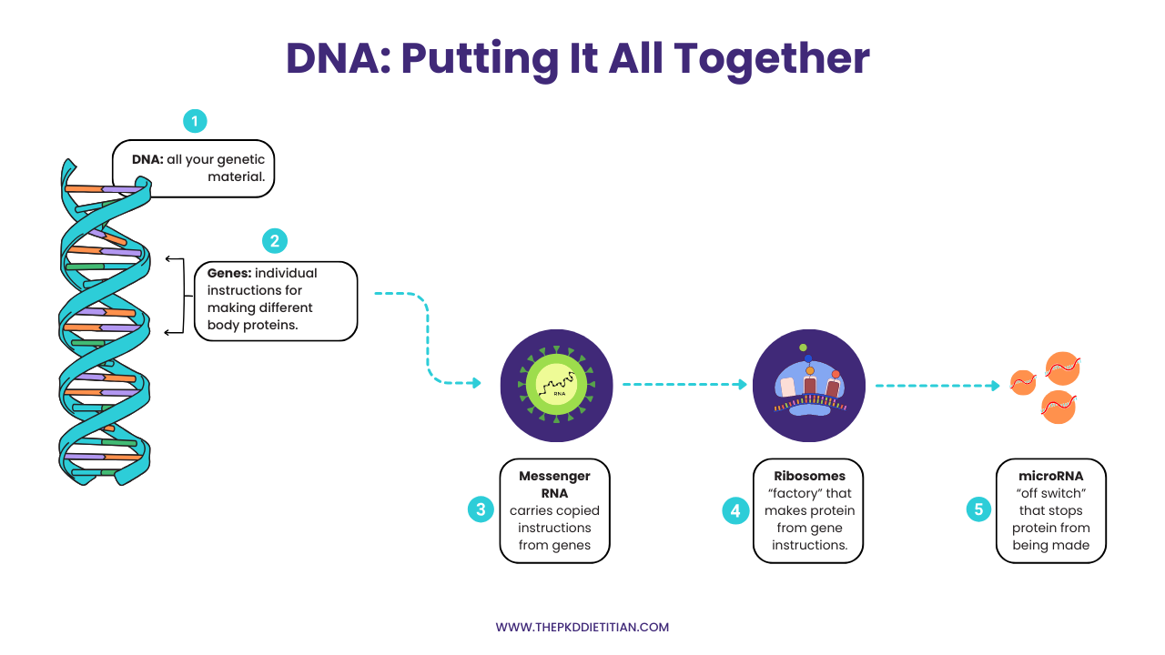 In short, micro RNAs stop genes from making too much of one type of protein. There you have it, your DNA in action, a quick refresher. Putting it all together, DNA is your body's complete instruction manual and within that manual, your genes are the individual instructions.