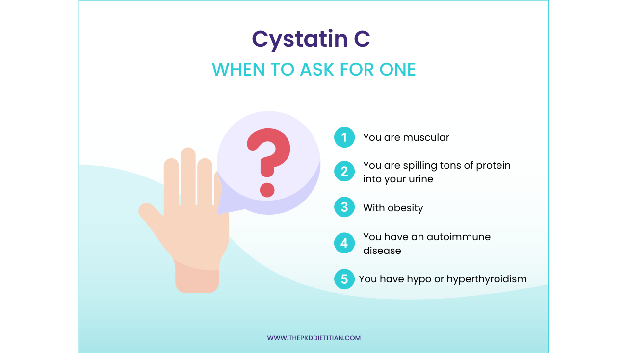 - Discuss Cystatin C with your doctor: If you're muscular, have a high BMI, or are spilling lots of protein spilling in your urine, ask your nephrologist for a Cystatin C tests. It might give a more accurate picture of your kidney function.